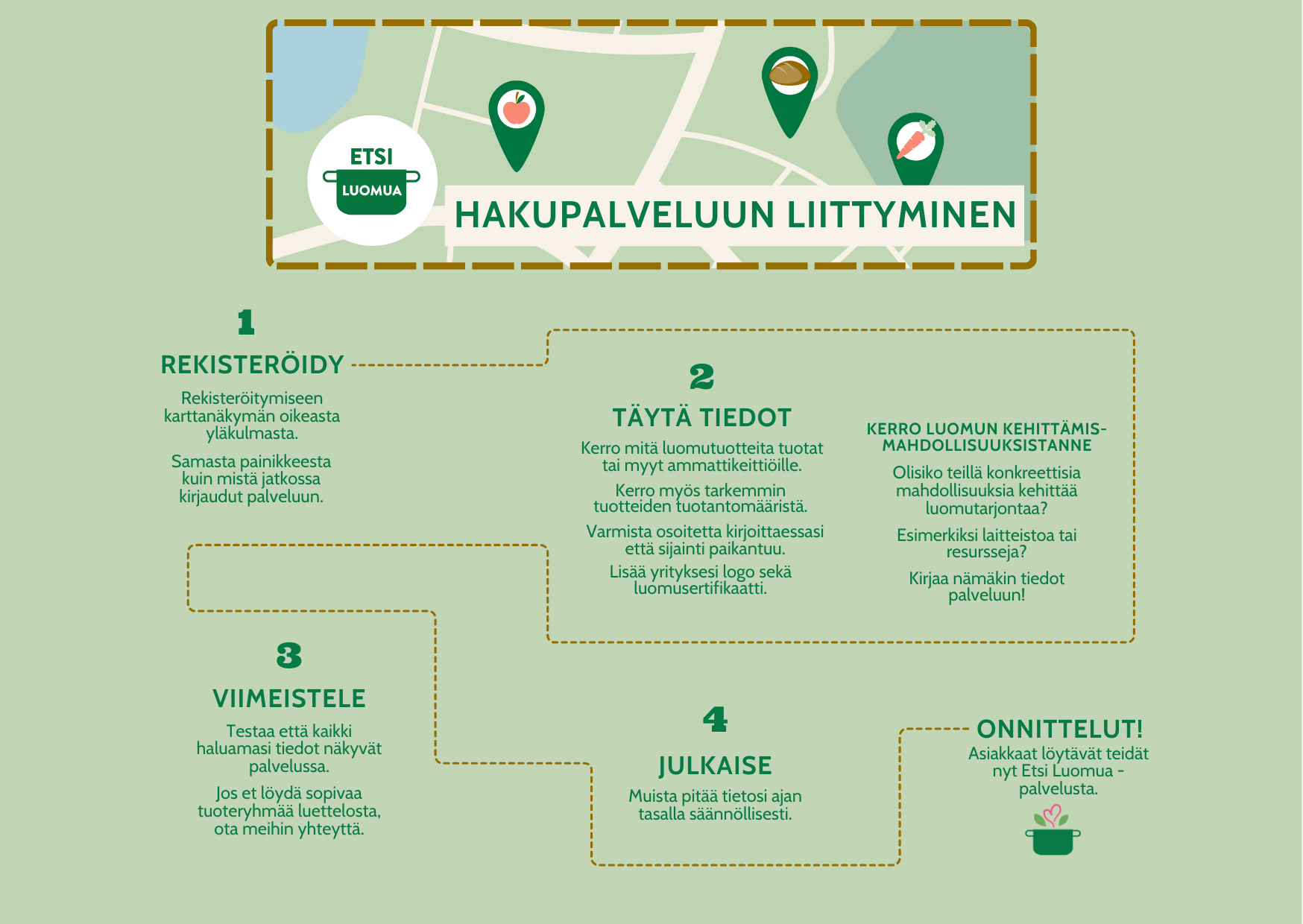 Luo profiili, jossa esittelet yrityksesi tarinan, luomutuotteesi ja yhteystietosi. Näin ammattikeittiöt ja tukut voivat löytää sinut helposti ja ottaa yhteyttä.